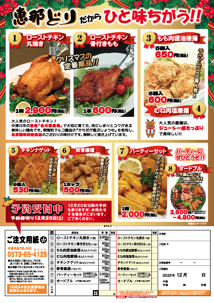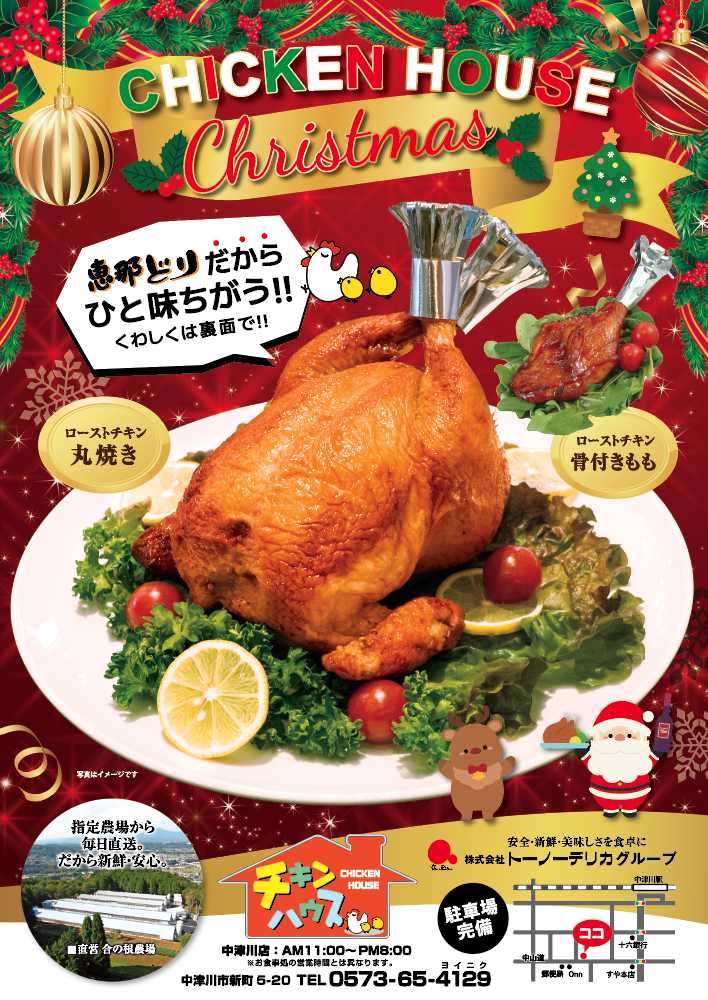 中津川市のチキンハウスでは丸焼きのローストチキンからパーティメーニューまでクリスマスメニューの予約を受付中!
